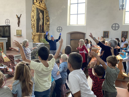 Traditionell wurden die Kinder zum Schulstart auch in der Kapelle mit einer ökumenischen Feier begrüsst. Zum Thema "Schritt für Schritt" hörten die Kinder die Geschichte des Strassenputzers Beppo, der immer Schritt für Schritt die Strassen putzt und so sicher ans Ziel gelangt. Auch im Schulalltag kommen die Kinder bestimmt ans Ziel, wenn sie alles "Schritt für Schritt" erledigen und nicht den ganzen Berg auf einmal bewältigen wollen.