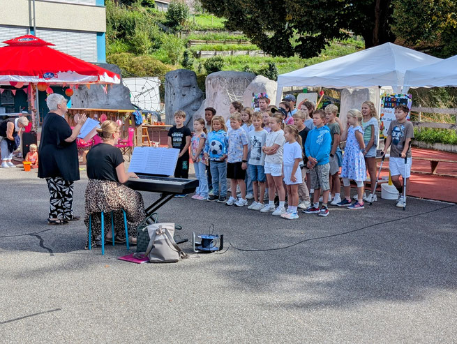Obwohl der Chor (Schüler/innen Zyklus 2) erst zwei Wochen in der neuen Zusammensetzung proben konnte, meisterten sie an der Hiltbrunnen-Chilbi bereits ihren ersten Auftritt. Unter der Leitung von Antonia Christen und Christine Aschwanden gaben sie einige Lieder zum besten und präsentierten ihre wunderschönen Singstimmen.